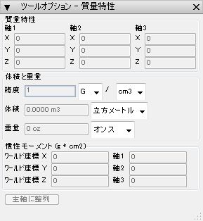 オブジェクトの質量特性を取得します。ツールをアクティブにして、オブジェクトをクリックします。[ツールオプション - 質量特性]パレットはオブジェクトの質量の情報を表示します。パレットは3つに分かれています:[質量特性]はオブジェクトの軸の情報を表示します。[体積と重量]にはオブジェクトの密度、体積、重量の情報があります。[慣性モーメント]には各座標/軸の情報があります。体積と重量の測定単位は各フィールドの横にあるメニューから選択します。