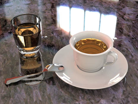 最新のシェーダーを使用して表面や他のエフェクトをレンダリングすることができます。マテリアルは最大4個のシェーダー(カラー、反射、透明度、バンプ)で定義されます。シェーダーで使用する模様は、事前に撮影した画像やプログラムで作成した画像を使用します。透明度、反射、屈折はZ-バッファとレイトレースによるレンダリング方式で利用することができます。Z-バッファ方式でレンダリングされるときも反射と屈折は正確にレイトレーシングによって生成されます。これは反射のない表面をZ-バッファでレンダリングし、反射のあるサーフェスのレンダリングエフェクトはレイトレーシングを使って生成する混合レンダリング方式によって実現されています。