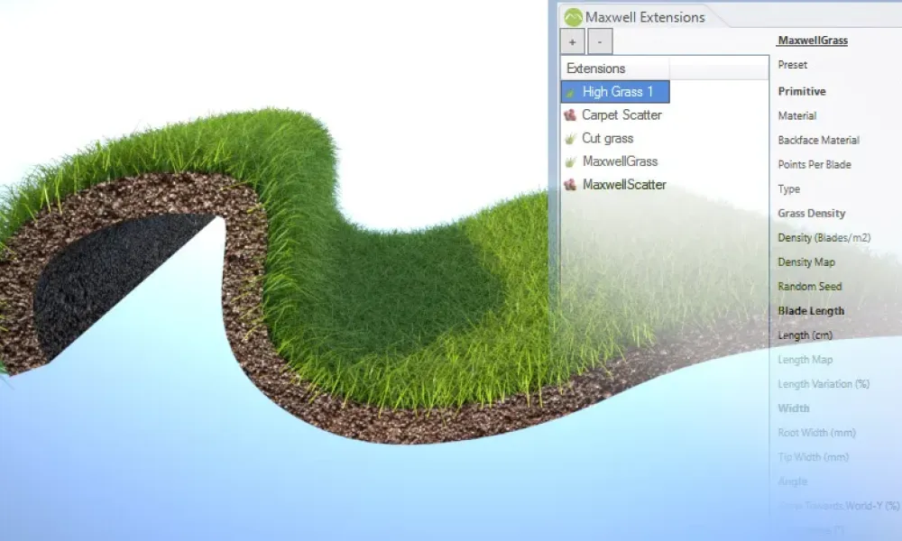Maxwell Grassを使用してシーン内の任意のオブジェクトから草を生やし、Maxwell Scatterを使って他のオブジェクトに数千のブロックインスタンスを散布します。新しい拡張パネルでは、さまざまな設定を作成、組み合わせ、シーン内の他のオブジェクトと共有することができます。