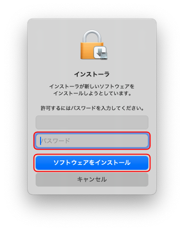 macOSの警告メッセージが表示されます。パスワードを入力し、ソフトウェアをインストールボタンをクリックしてください。インストールが始まります。