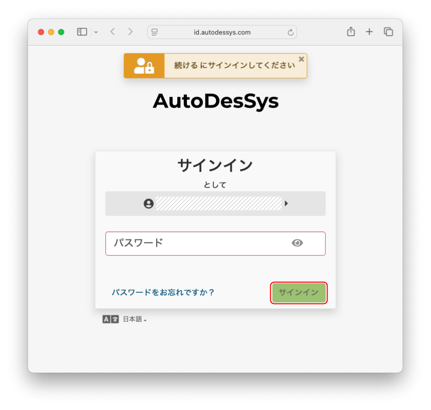 パスワード入力画面が表示されたら、ライセンスサーバーのアカウントパスワードを入力し、サインインをクリックしてください。